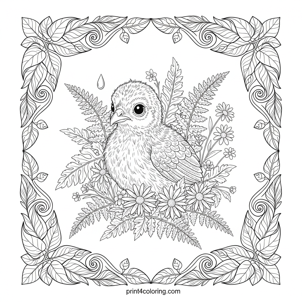 Discover a charming baby turkey, called a poult, with wonderfully soft, detailed feathers and big, curious eyes. It's peeking from a lush bed of intricately drawn ferns and vibrant wildflowers. Look closely for a sparkling dewdrop on a leaf, adding a tiny, beautiful detail to this expert-level scene. A delightful nature adventure awaits your colors!