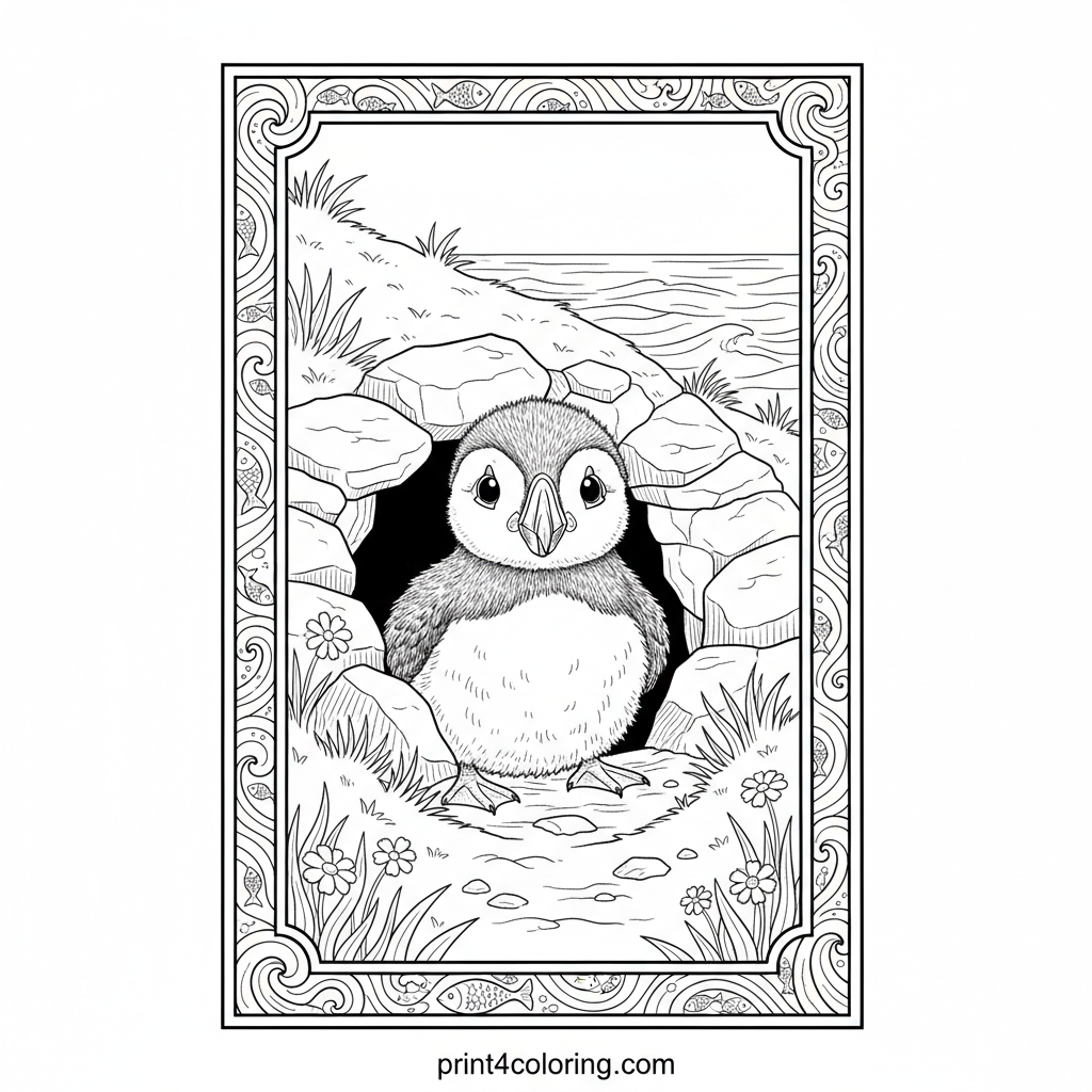 Meet an adorable baby puffin, a 'puffling', with soft, downy feathers and big, curious eyes! This charming scene shows the little bird peeking from its cozy burrow on a grassy cliff. The vast ocean stretches subtly in the background, inviting you to imagine its first big adventure. Perfect for expert colorists!