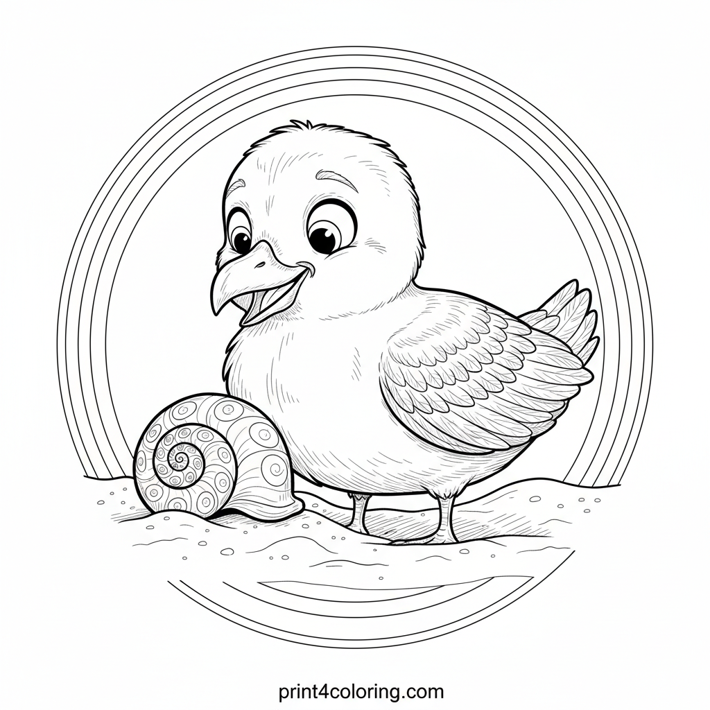 Join a charming seagull on an exciting beach adventure as it discovers a magnificent, ornate seashell! With a slightly surprised look, our feathered friend carefully inspects its sandy treasure. This detailed scene invites you to bring the sunny beach and its wonders to life with your favorite colors.