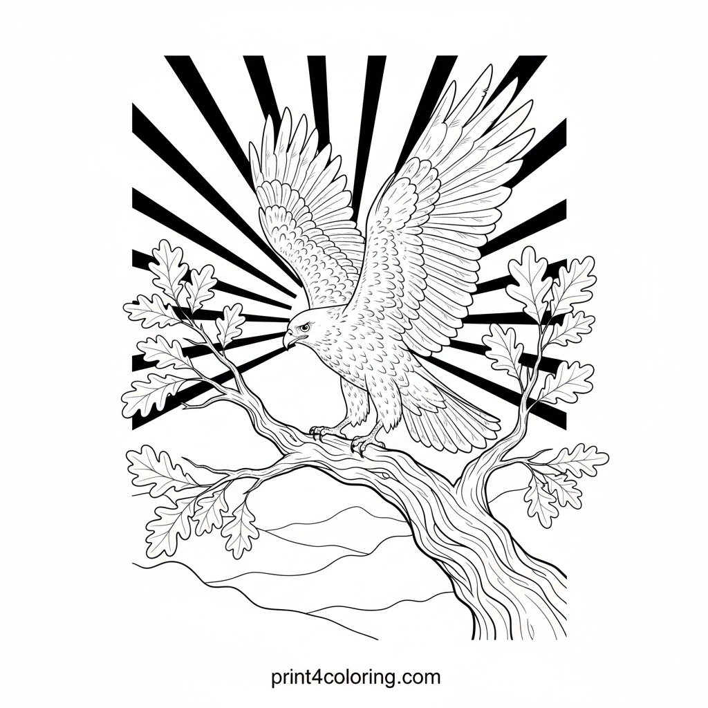 Witness the breathtaking beauty of a powerful hawk, a sentinel of the dawn, as it surveys a peaceful, misty valley from its gnarled oak perch. The rising sun paints the sky in vibrant hues, casting a dramatic silhouette. Bring this majestic scene to life with your colors.