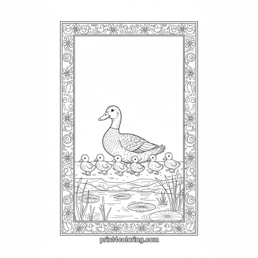 Join a mother duck as she proudly leads her adorable, fluffy ducklings in a perfect single file line towards a peaceful pond. This expert-level coloring page features intricate details, from delicate reeds and lily pads to gentle water ripples. A charming scene perfect for focused coloring.