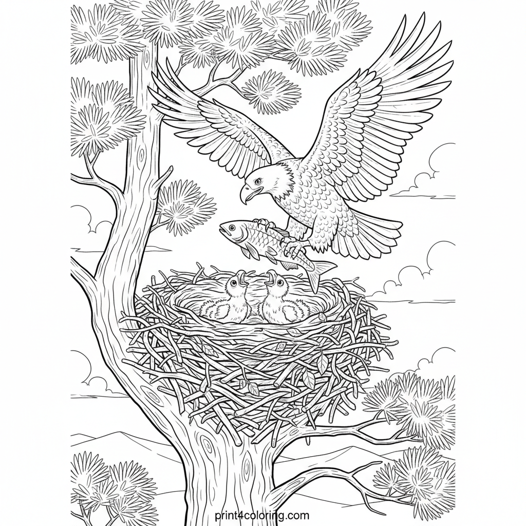 Soar into an amazing scene where a powerful eagle brings a fresh fish dinner to its hungry eaglets! High in a detailed pine tree nest, two fluffy babies eagerly await their meal. This expert-level page invites you to color every feather, scale, and pine needle, capturing a heartwarming moment of nature's care.
