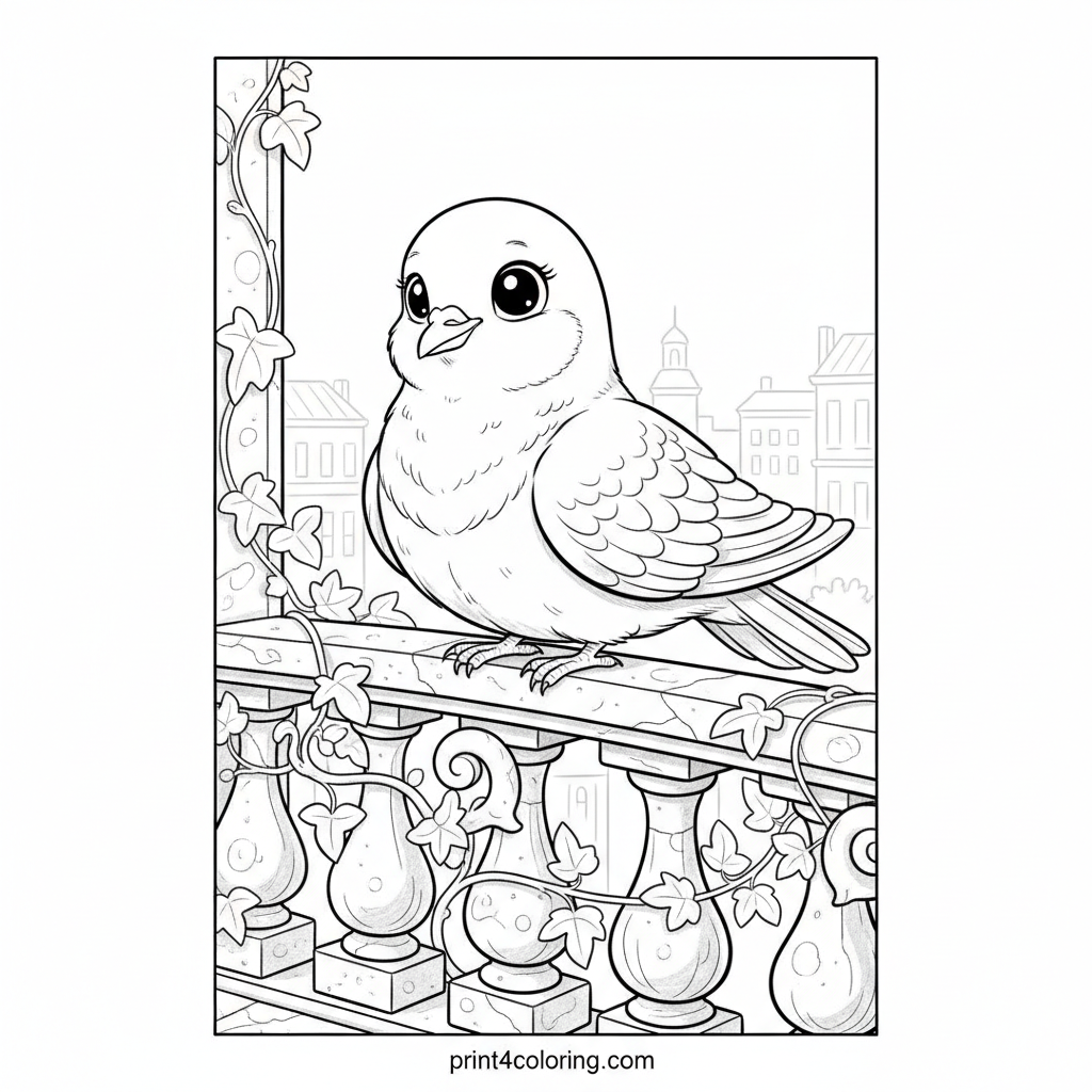 Imagine a beautiful dove, soft and white, resting gently on a magnificent stone balcony. Intricate carvings adorn the railing, while graceful ivy climbs nearby. In the distance, you can glimpse the charming rooftops and towers of an old city. This peaceful scene invites you to add your most delicate colors.