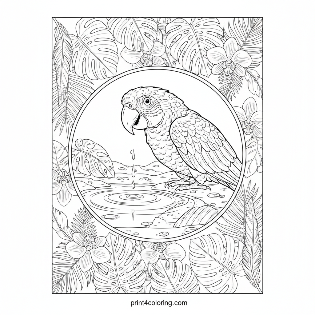 Emerald Gaze: A Parrot's Puzzled Puddle Reflection Coloring Page
