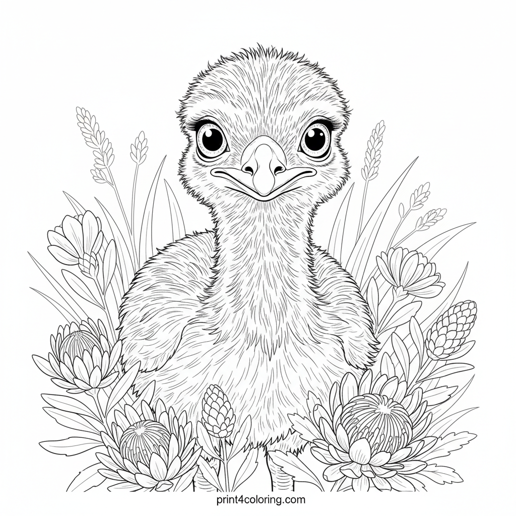 Discover the charm of a fluffy baby emu chick, peeking curiously from a bed of vibrant Australian wildflowers. This detailed close-up captures its wonder-filled eyes and soft, downy feathers, inviting you to add your own burst of color to its delightful world. A perfect scene for nature lovers to explore!