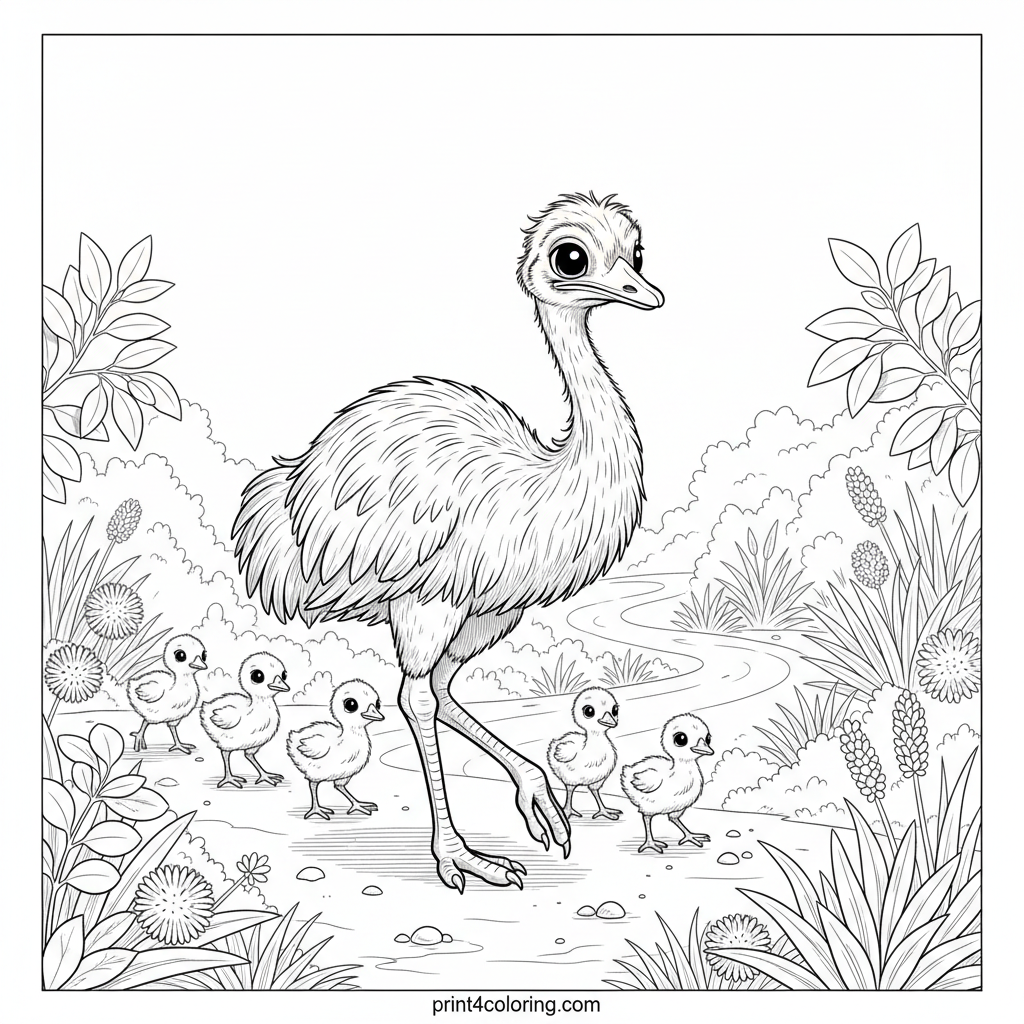 Embark on a serene Australian adventure! This expert coloring page features a majestic adult emu guiding its fluffy chicks through sun-dappled bushland. Observe the purposeful stride of the parent and the curious pecking of the little ones. Detailed native plants and realistic shadows invite you to bring this heartwarming family journey to life with vibrant colors.