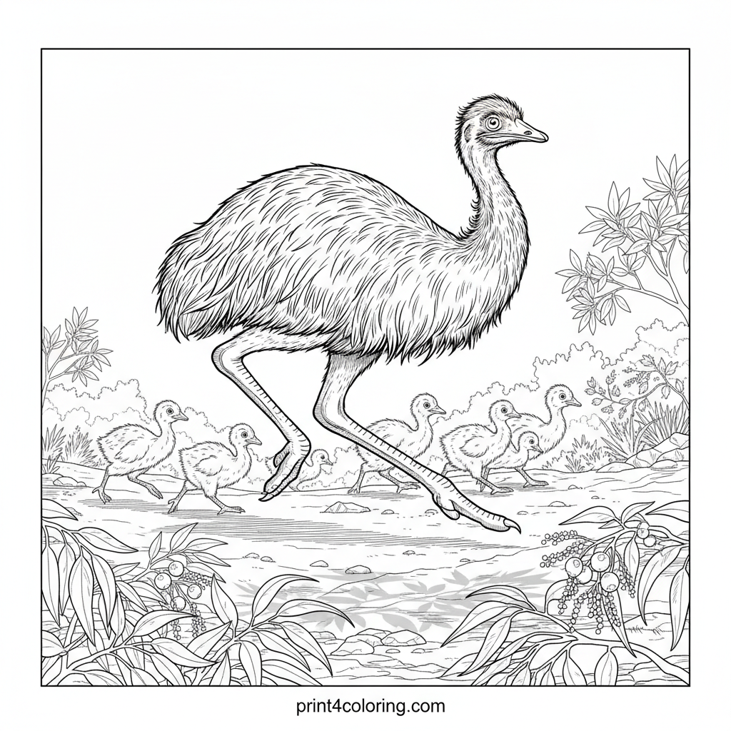 Witness a majestic adult emu guiding its adorable, fluffy chicks through the Australian bushland. They explore a sun-dappled path, pecking at interesting treasures. This detailed scene, with native plants and dappled shadows, offers a serene and educational coloring experience, capturing the beauty of nature's journey.