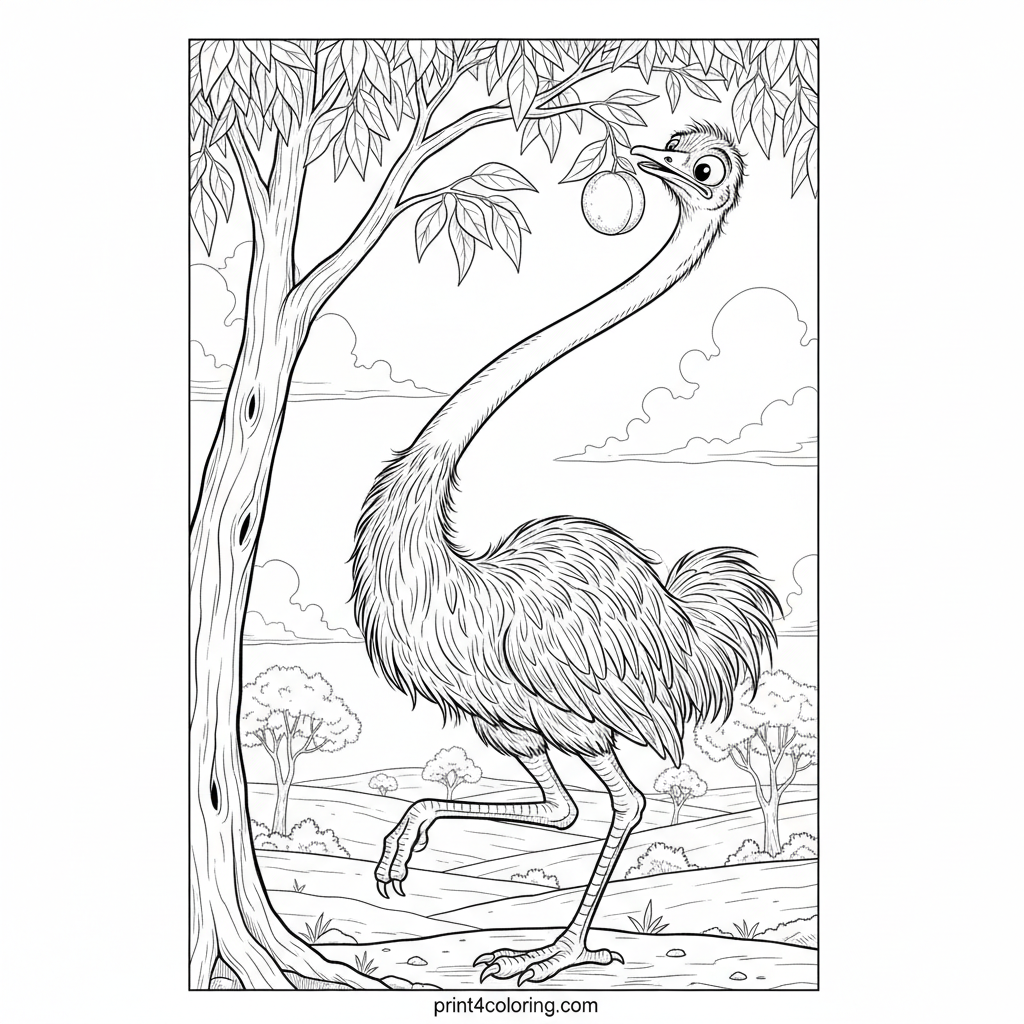 Watch this determined emu stretch its long neck to reach a delicious, high-hanging fruit! With bent knees and a focused expression, it's putting in maximum effort for a tasty treat. This detailed scene captures the humor and wonder of nature, inviting you to add vibrant colors to its feathers, the ripe fruit, and the native tree.