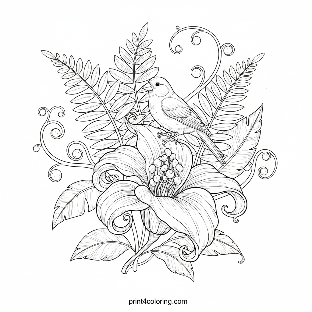 Discover a charming canary perched delicately on a magnificent, glowing flower with unique petals and tendrils. Explore the detailed secret garden background filled with whimsical plants, waiting for your creative colors. A magical scene for budding artists to bring to life!