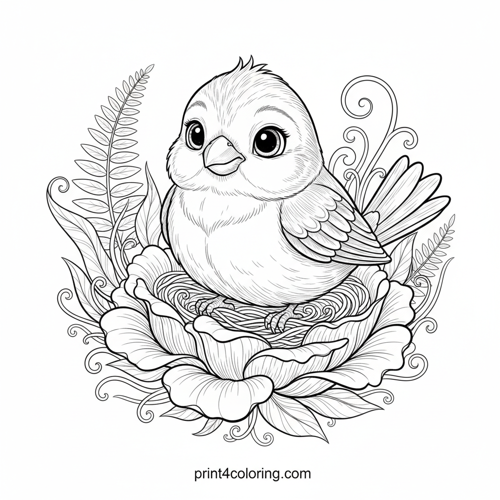 Dive into a world of wonder with a sweet canary resting on a giant, glowing flower! Explore intricate petals, swirling tendrils, and a hidden garden filled with amazing plants. This detailed scene invites you to unleash your creativity and bring its whimsical beauty to life.