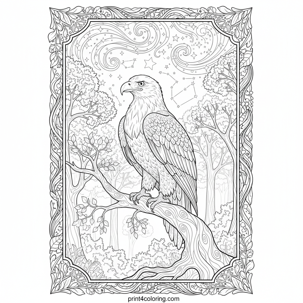 Journey into a magical forest where a majestic eagle, perched on a glowing, ancient branch, gazes up at a sky bursting with dazzling constellations and swirling nebulae. This intricate scene invites you to bring vibrant life to the eagle, the enchanting patterns, and the cosmic wonders above. Perfect for expert colorists!