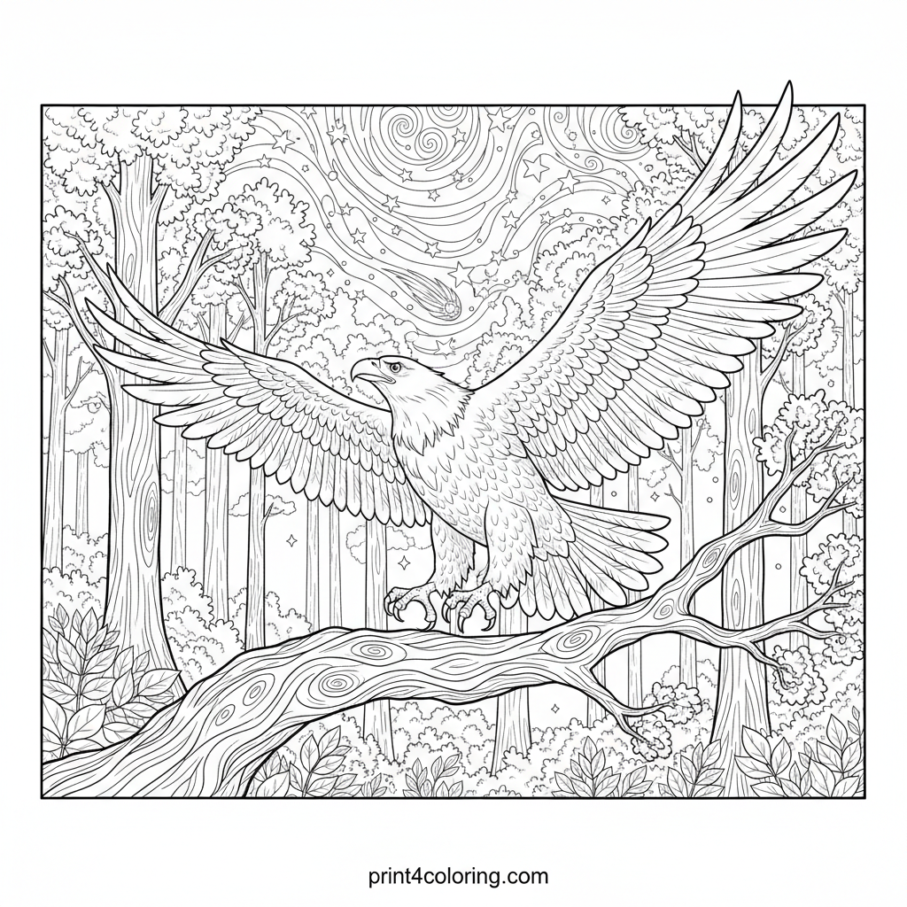 Soar into a world of wonder with this majestic eagle, perched on a glowing, gnarled branch. Below, a fantastical forest whispers secrets, while above, a dazzling night sky explodes with intricate constellations and swirling nebulae. A challenging and rewarding coloring adventure awaits!