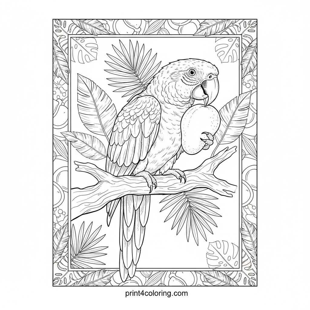 Step into a lush rainforest! A magnificent Amazon parrot savors a juicy tropical fruit, perhaps a mango or starfruit, perched on a detailed branch amidst vibrant leaves. This intricate nature study captures the beauty of exotic flora and fauna. Bring this bountiful feast to life with your most brilliant colors!