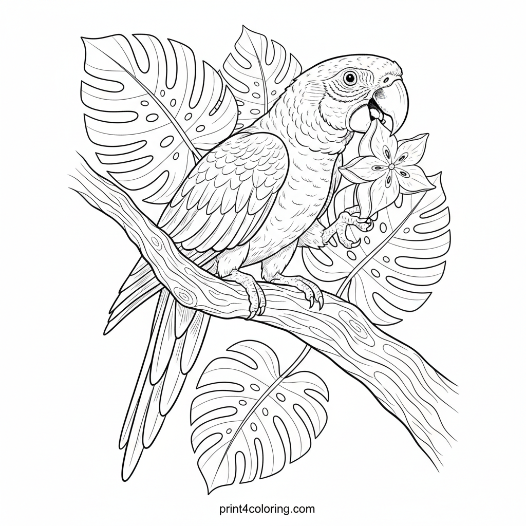 Dive into a vibrant jungle scene! This detailed coloring page features a magnificent Amazon parrot, perched gracefully, enjoying a delicious bite of a ripe, juicy tropical fruit. Every feather, leaf, and fruit texture is intricately drawn, inviting you to bring this exotic nature study to life with your most brilliant colors.