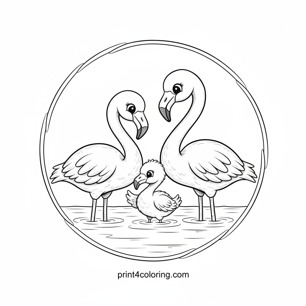 Dive into a heartwarming scene with a beautiful flamingo family! Two elegant adult flamingos gently wade in shallow waters, keeping their fluffy, grey chick safe between them. One adult preens while the other watches over their little one. Capture the serene beauty of their bond and the shimmering water textures with your colors.