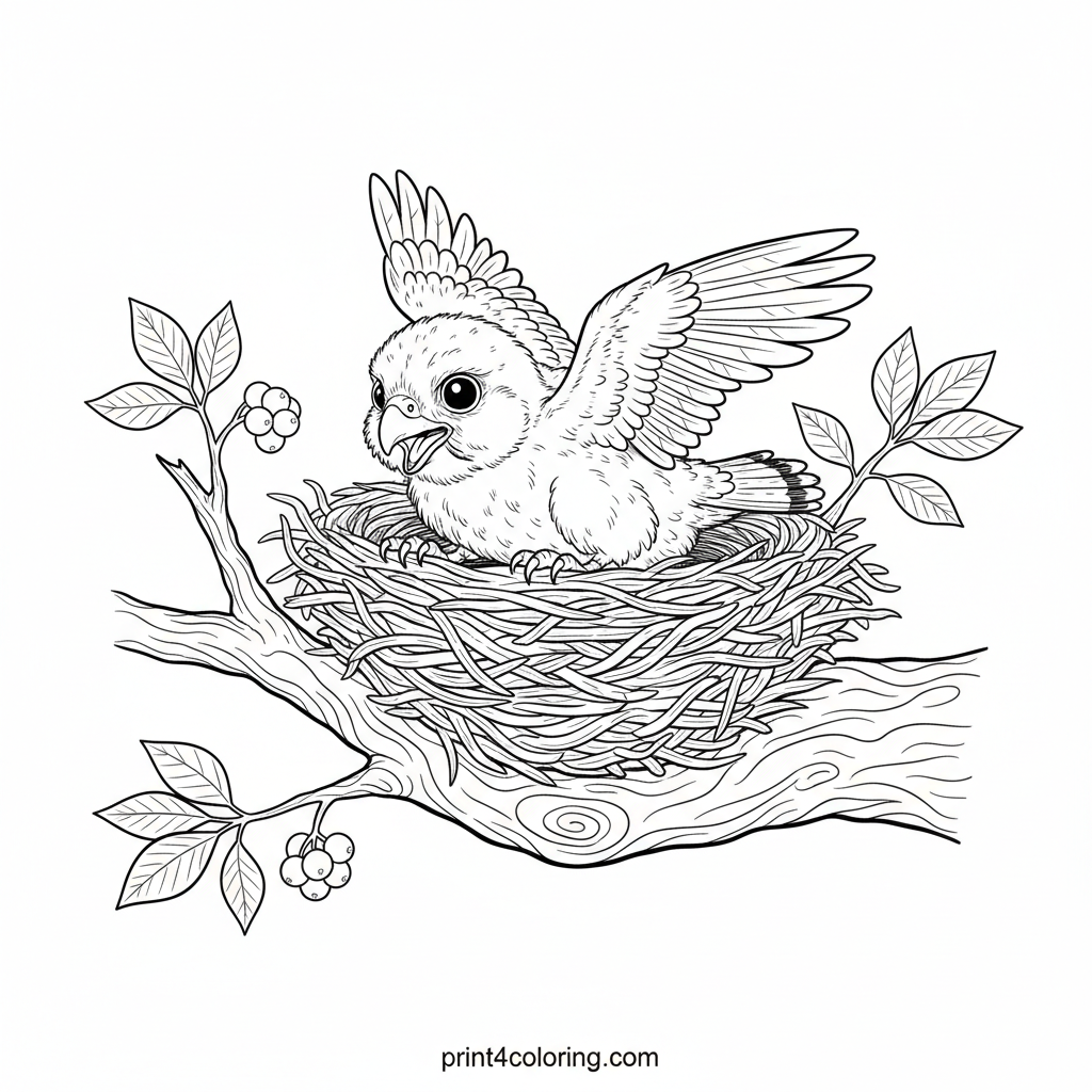 Meet a fluffy, wide-eyed fledgling falcon taking its first curious peek out of a cozy, detailed nest. Perched high on a sturdy tree branch, surrounded by finely drawn leaves and small berries, this baby bird is ready for your creative colors. Bring this charming scene to life!