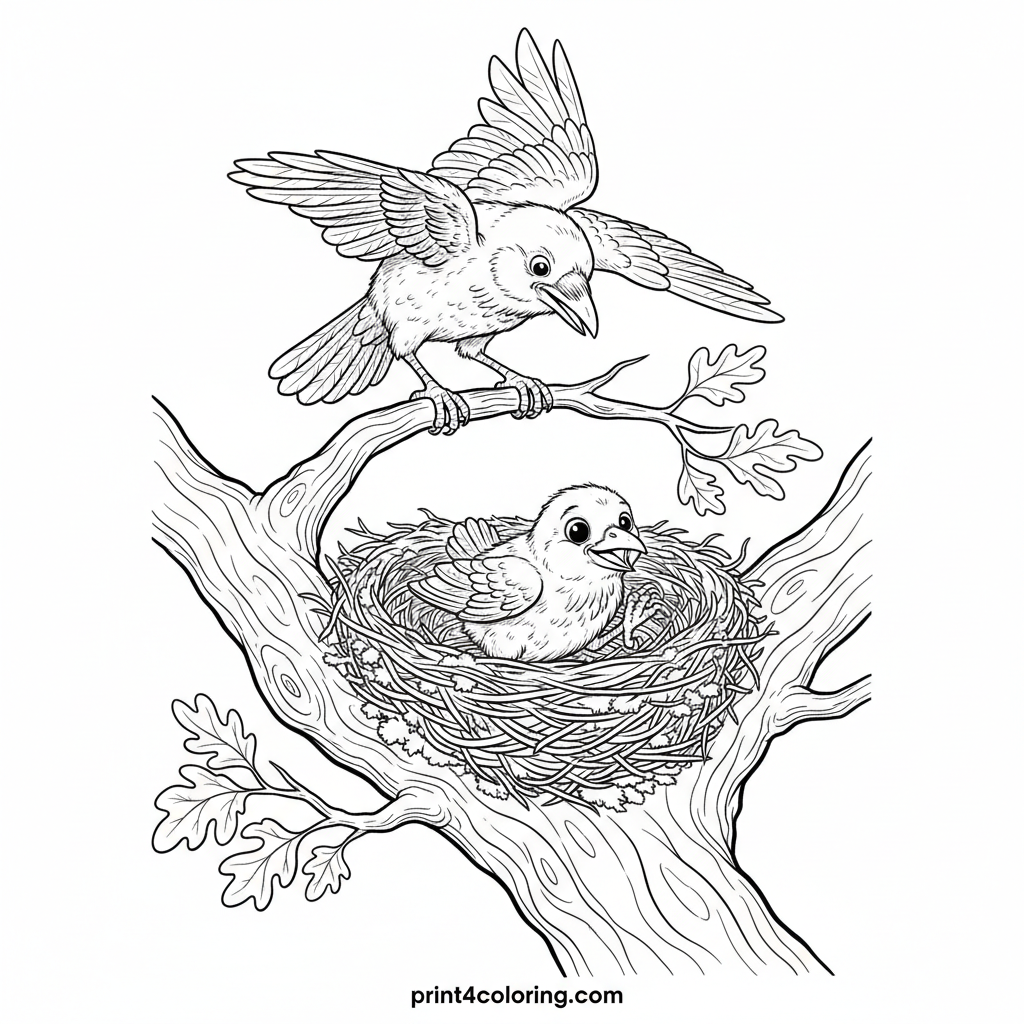 Discover a heartwarming moment as a fluffy baby crow, a curious fledgling, peeks over its sturdy nest for the very first time! An adult crow watches carefully from above in an old oak tree. This detailed scene invites you to bring the wonder of nature to life with your colors.
