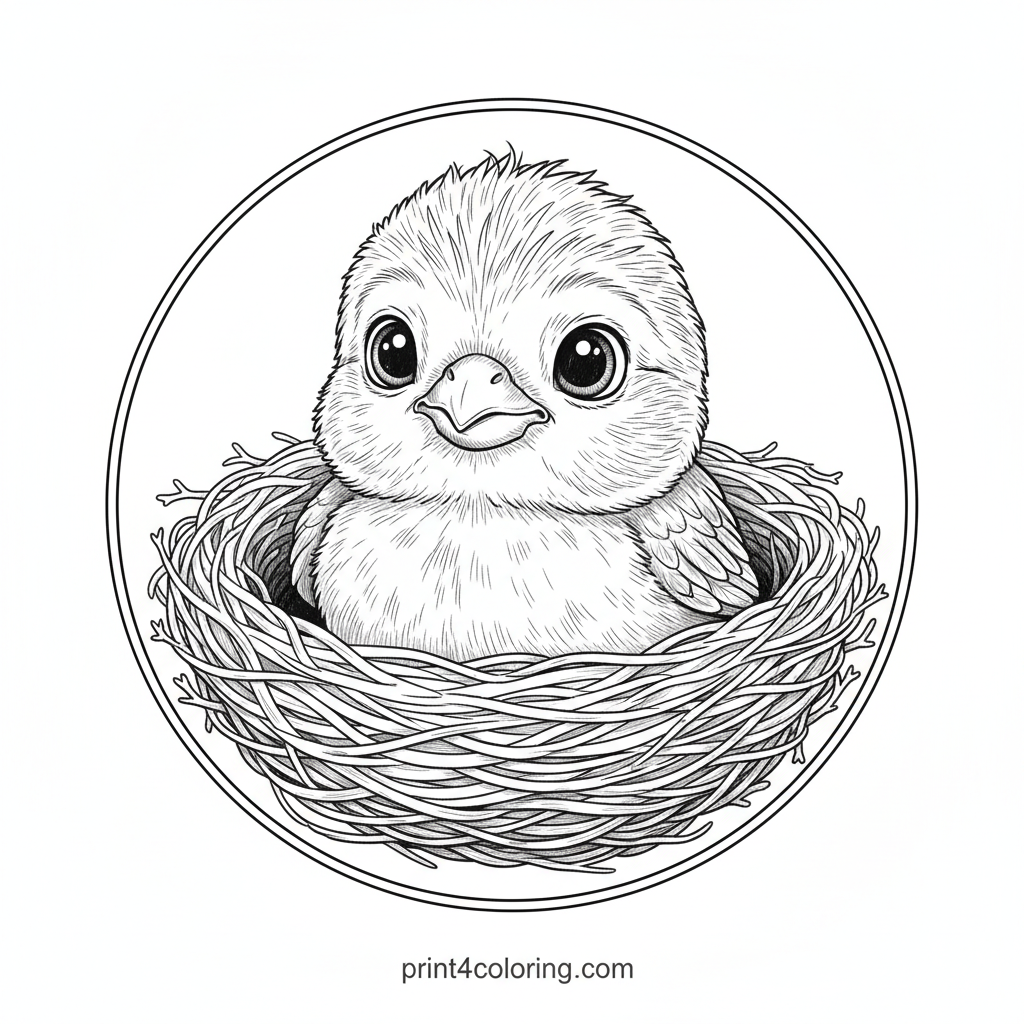 Discover the heartwarming moment a tiny, fluffy canary hatchling peeks from its intricately woven nest for the very first time! With soft downy feathers and expressive eyes, this sweet baby bird is full of wonder. Color the cozy textures and bring this adorable scene to life, imagining the gentle chirps of a new beginning.