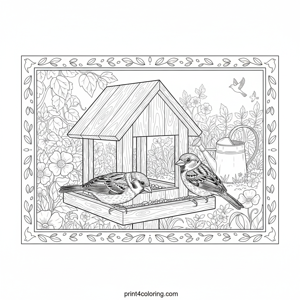 Discover the simple joy of nature with this charming coloring page! Two busy sparrows enjoy a feast at a classic wooden bird feeder, surrounded by lush garden foliage. Spot the vintage watering can and other garden details, ready for you to bring to life with your favorite colors. A delightful scene for all ages!