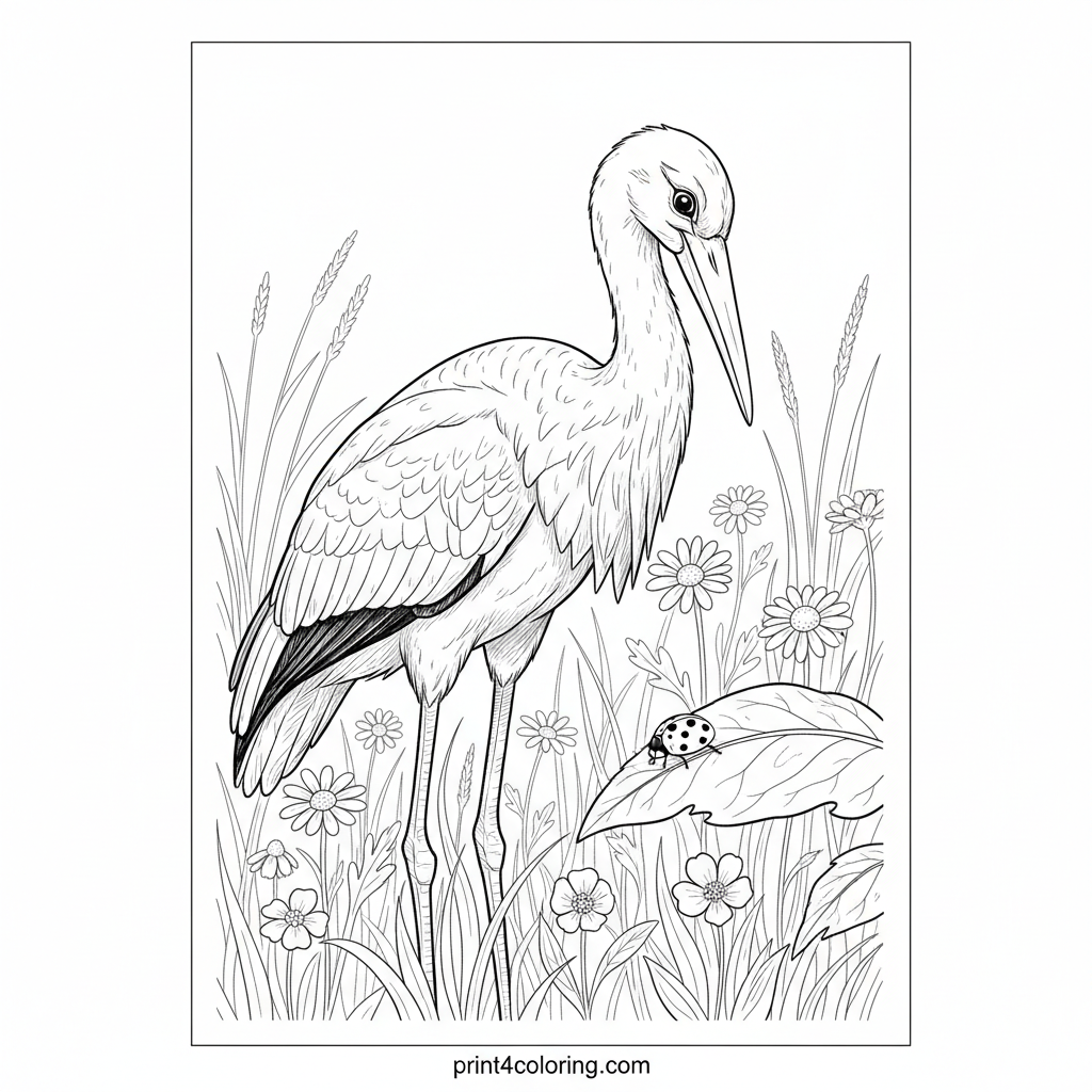 Observe a magnificent stork, a gentle giant, as it carefully bends its long neck to greet a tiny, vibrant ladybug. This detailed scene is set amidst a lush field of wildflowers and large leaves, highlighting the beauty of nature's contrasts. A perfect page for expert colorists to explore delicate details and rich textures.