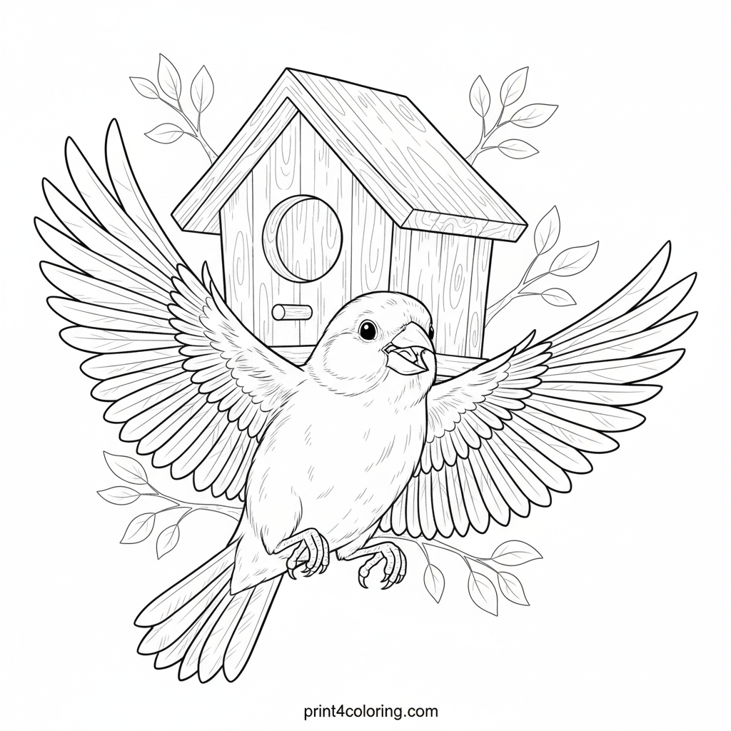 Capture the beauty of a canary in dynamic mid-flight, wings elegantly spread, as it approaches a charming, old-fashioned wooden birdhouse. This detailed scene features individual feather textures and a gently blurred natural background. Bring vibrant life to every delicate detail of this graceful bird and its cozy abode!