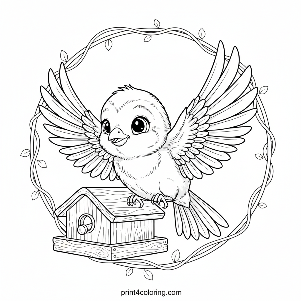Witness the beauty of a canary in full flight! This detailed coloring page captures a charming canary just as it gracefully lifts off from a cozy bird feeder. Its wings are fully extended, showing every delicate feather. Bring this moment of avian energy to life with your favorite colors, imagining its sweet song!