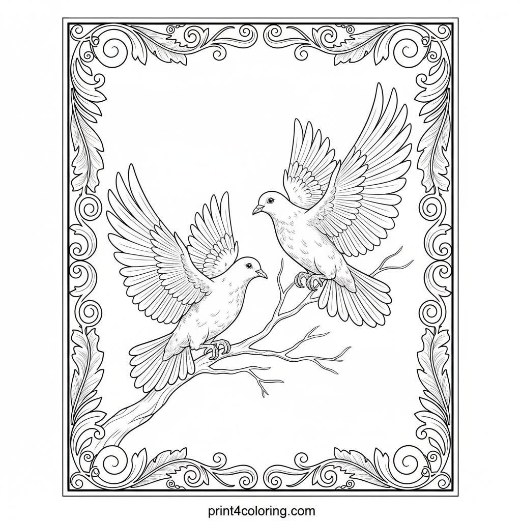 Watch as two magnificent doves gracefully ascend from a leafy branch, wings spread wide in a moment of pure freedom. This intricate coloring page captures the beauty of their detailed feathers and the gentle motion of their flight against a soft, blurred background. A perfect scene for tranquil and focused coloring, inviting you to add your artistic touch.