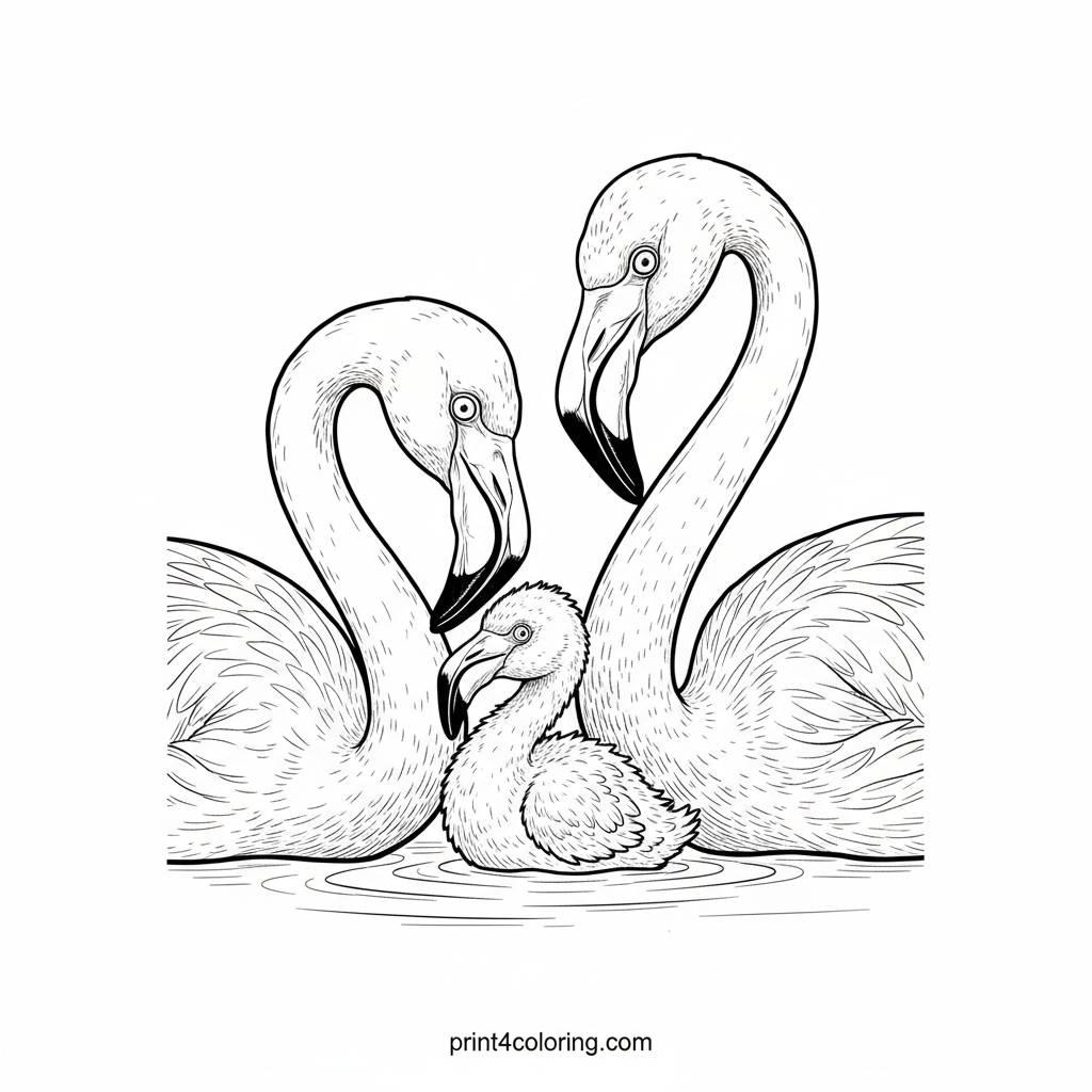 Dive into a serene scene with a beautiful flamingo family! Two elegant adult flamingos wade gently in shallow waters, their fluffy grey chick nestled safely between them. One parent preens, while the other watches over their little one, all bathed in soft light. A perfect page for detailed coloring.