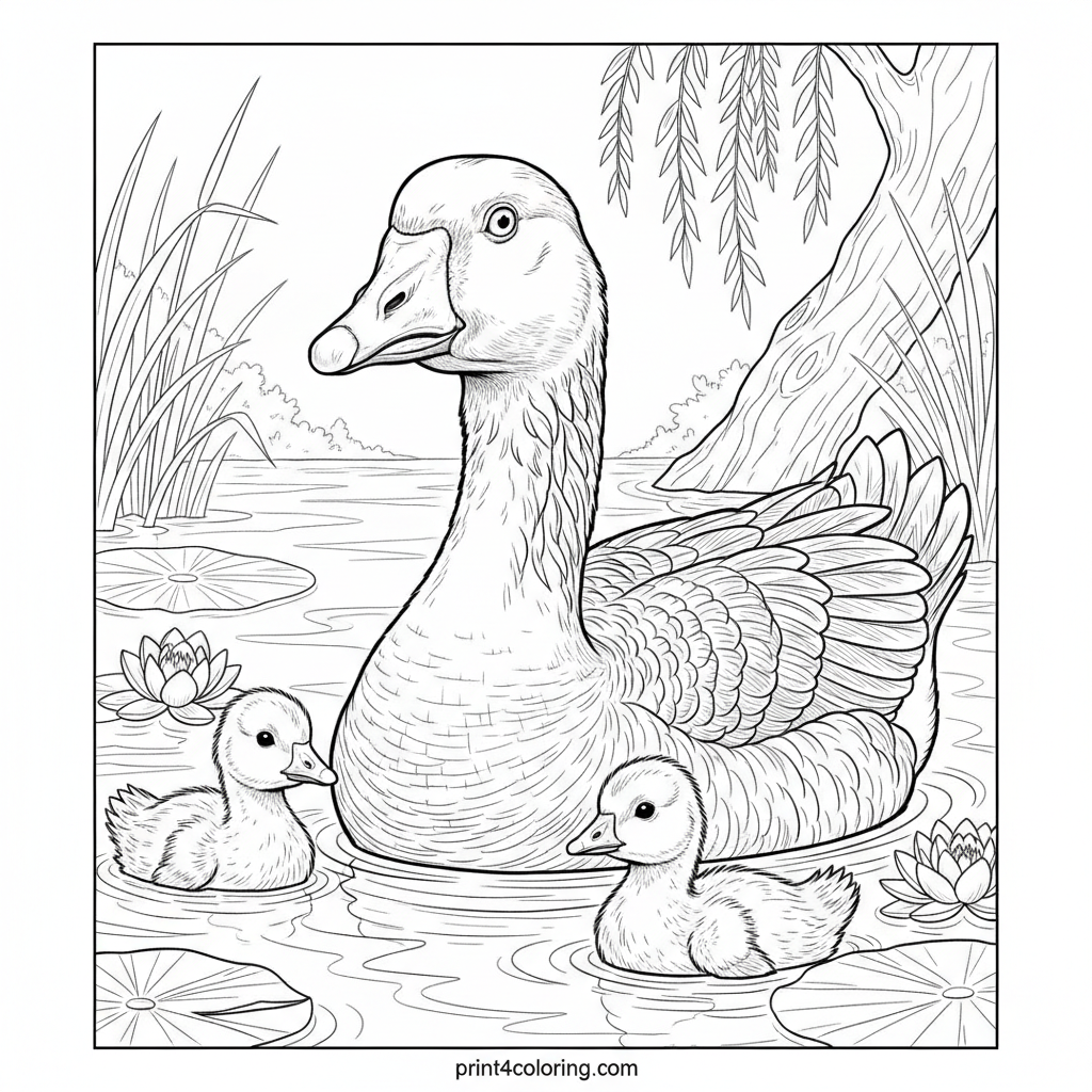 Dive into nature with this serene coloring page featuring a loving mother goose and her five adorable goslings. Watch them swim gracefully in a clear river, surrounded by tall reeds, delicate water flora, and the textured bark of a leaning willow tree. A beautiful close-up portrait perfect for detailed coloring!
