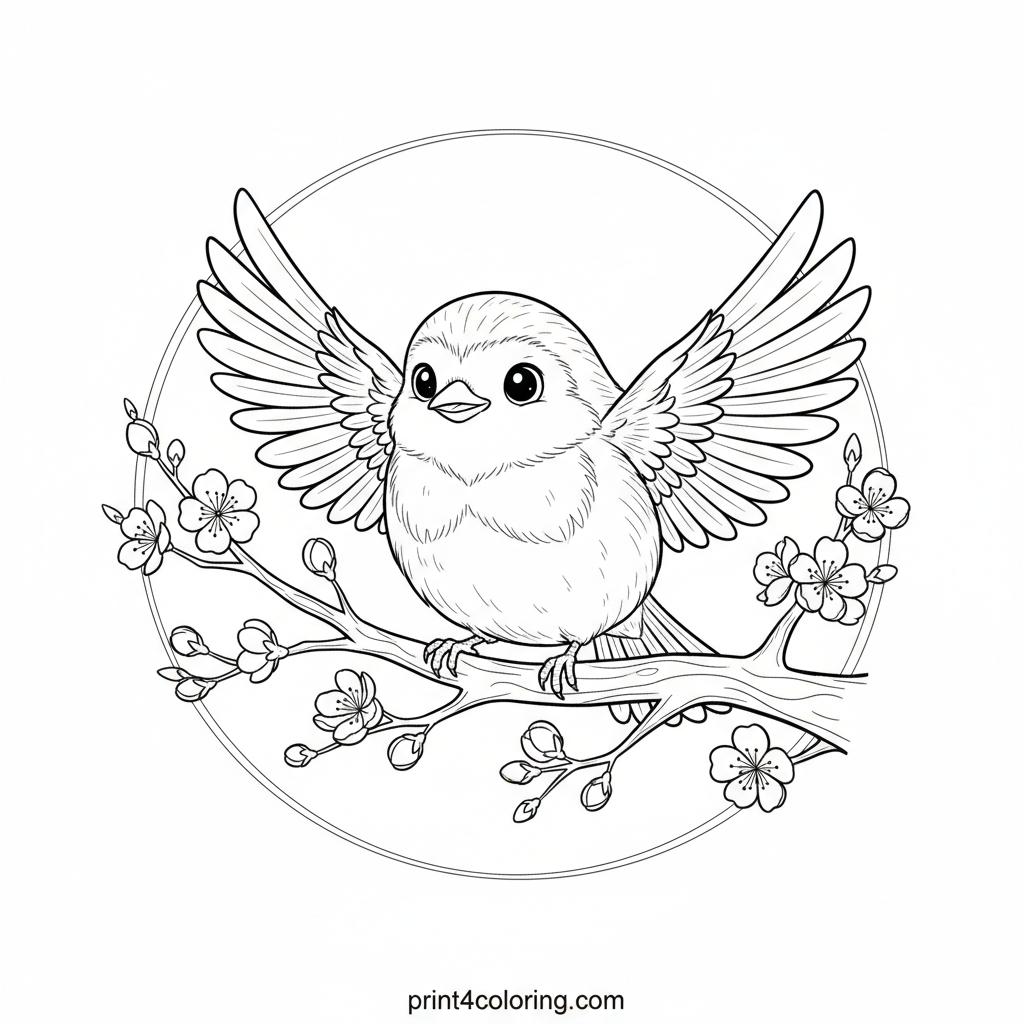 Witness the delicate beauty of a vibrant robin in mid-flight, wings spread wide, ready to land on a branch adorned with fresh spring blossoms. This intricate scene invites you to bring the magic of nature to life. A perfect challenge for expert colorists to enjoy!