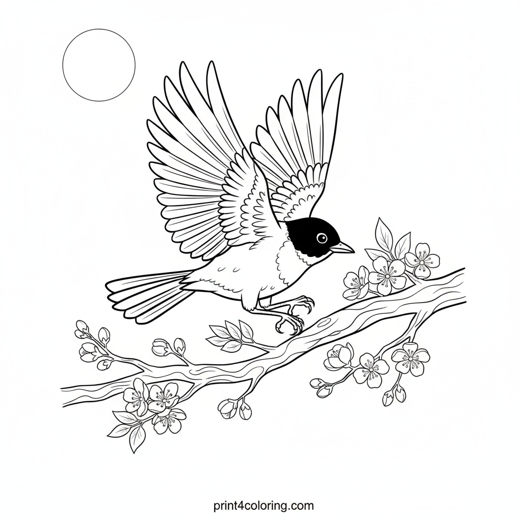 Watch as a beautiful robin, wings spread wide, prepares for a gentle landing on a branch bursting with new spring blossoms. Its feathers are detailed, ready for your colorful touch, set against a peaceful sky. A perfect scene to celebrate the joy of spring and nature's delicate beauty!