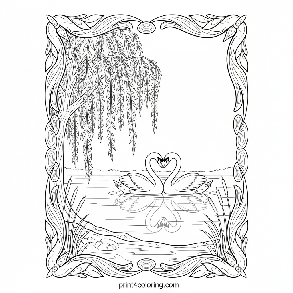 Graceful Swans and Weeping Willow Embrace Coloring Page