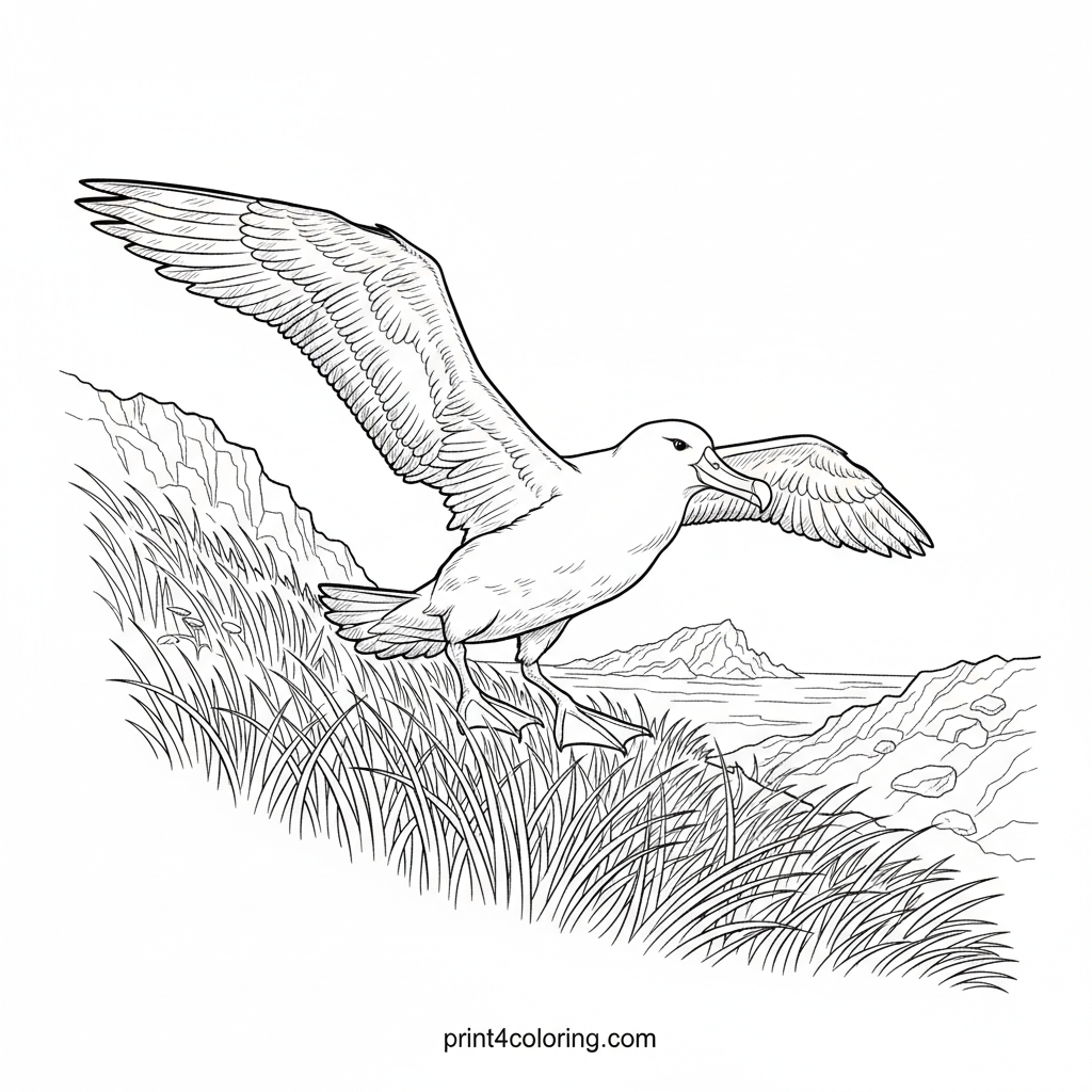 Witness the breathtaking moment a magnificent albatross gracefully lands on a windswept, grassy cliff. Its vast wings are still spread for balance, surrounded by unique island plants and distant rocky outcrops. A challenging and rewarding scene for expert colorists!