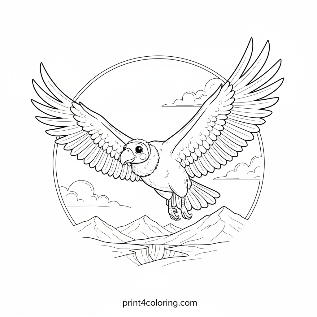 Witness the breathtaking flight of a magnificent Grand Condor, gracefully gliding above towering, jagged mountain peaks and deep canyons. Its powerful wings are fully extended, catching the wind with effortless elegance. Explore intricate feather details and dramatic cloud formations, bringing this majestic scene to life with your colors.