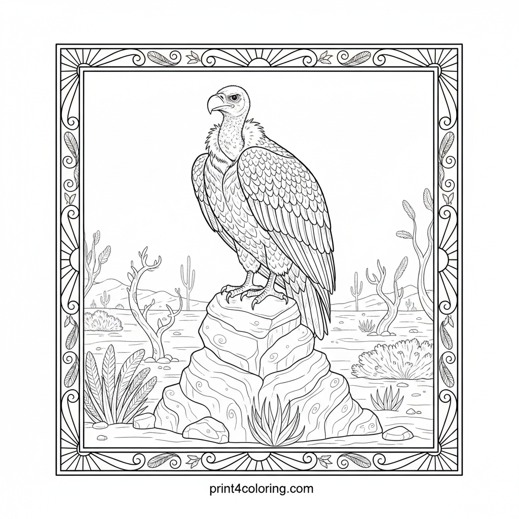 Embark on a mystical coloring journey with the Guardian of the Whispering Peaks! A wise vulture with magnificent, detailed feathers perches regally on a softly glowing ancient rock. Below, a serene, fantastical desert unfolds with unique plant life, inviting you to bring this watchful, magical scene to life.