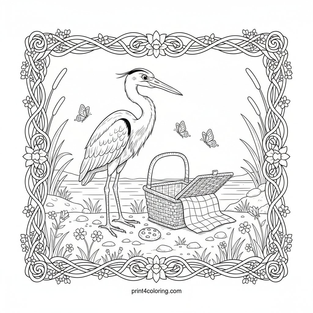 Heron's Gentle Curiosity Picnic Coloring Page