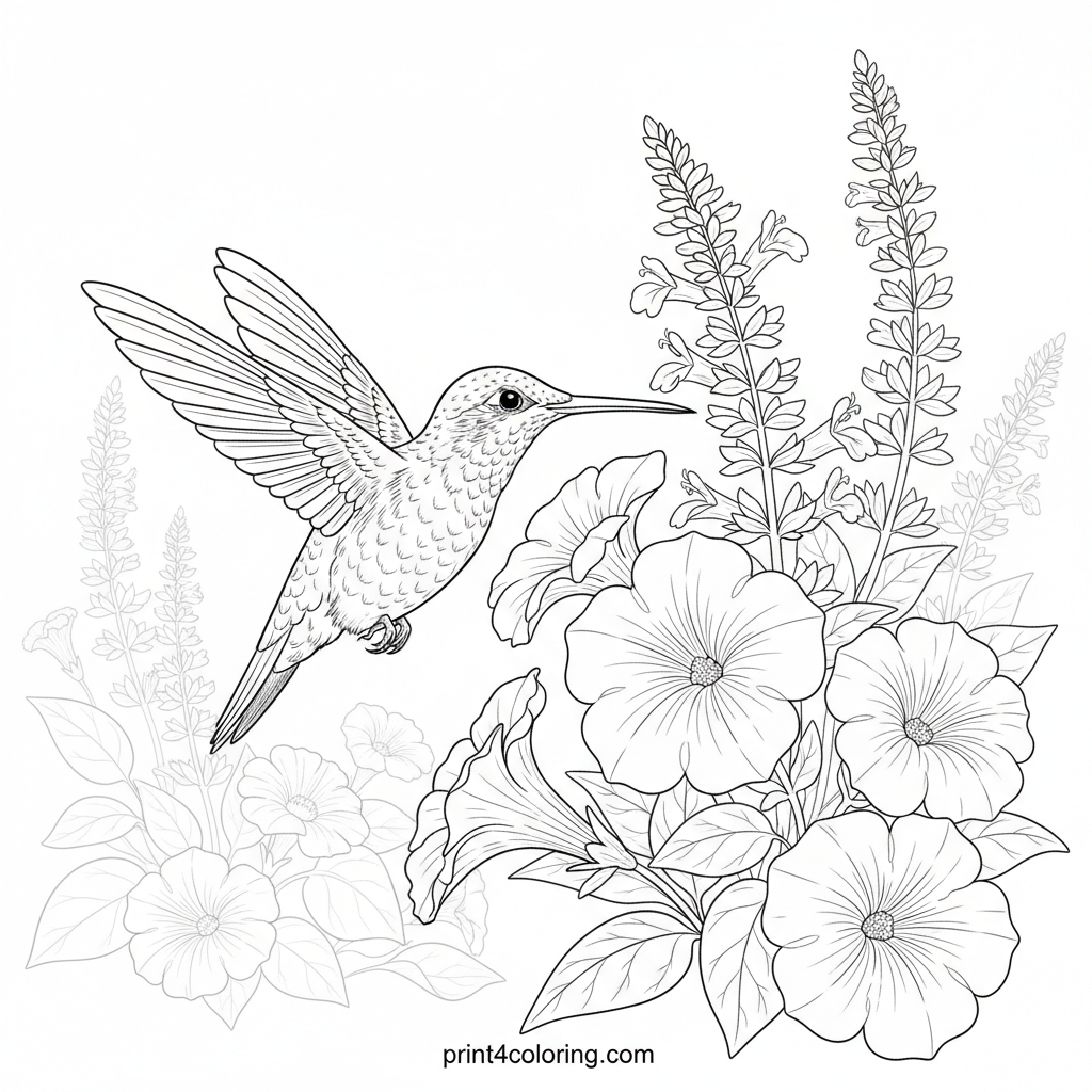 Get ready to color a breathtaking scene! A tiny, magnificent hummingbird zips through a vibrant garden, its wings a beautiful blur of motion. Watch as it gracefully hovers, aiming its long beak at sweet petunias and salvias. Capture the magic of this speedy visitor amidst detailed blossoms!