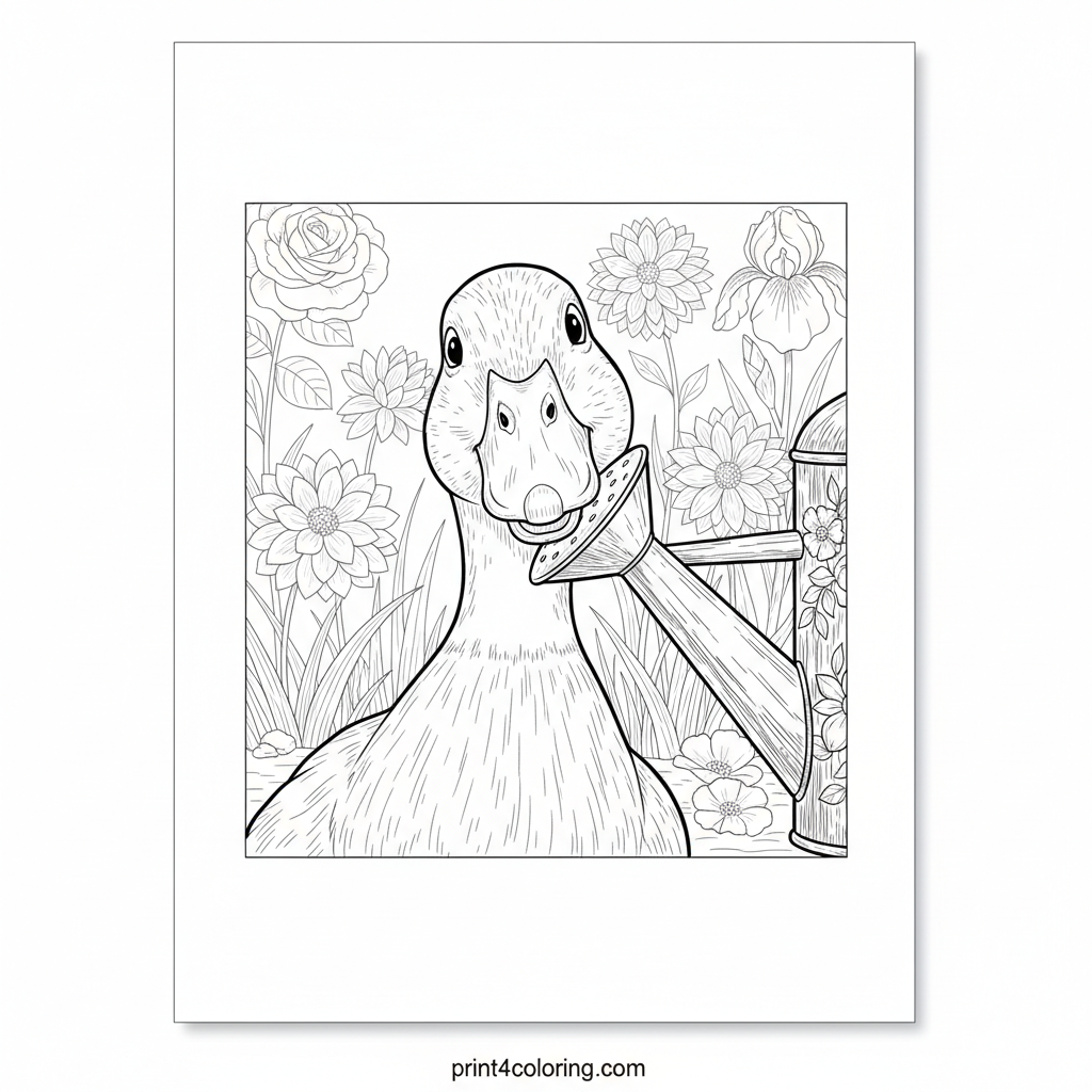#duck#garden#watering-can#flowers#nature#curious-animal#coloring-page#printable