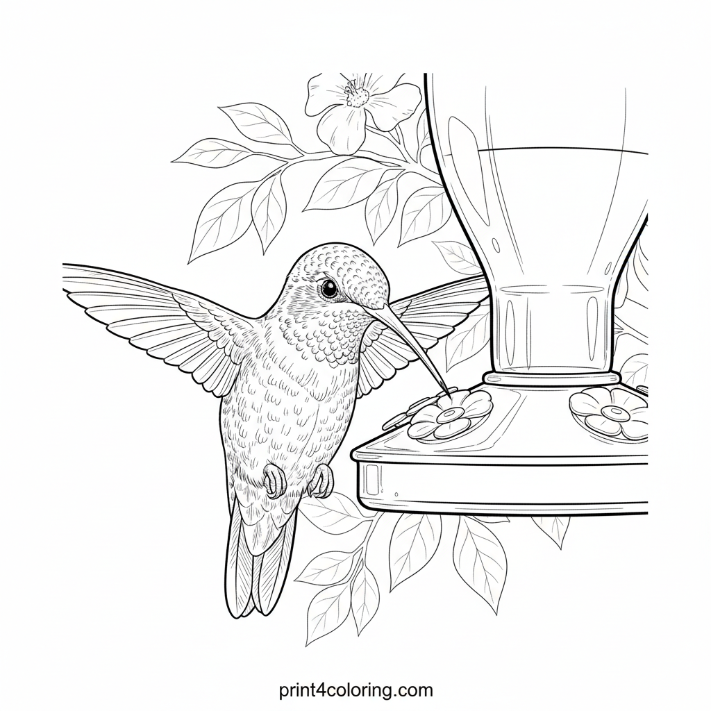 Capture the delicate beauty of a hummingbird as it sips sweet nectar! This expert-level page features a finely detailed hummingbird hovering gracefully at a glass feeder, its long tongue reaching for a morning treat. Intricate reflections and soft leafy branches in the background invite a symphony of colors. A rewarding challenge for aspiring artists!