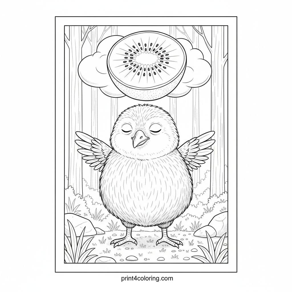 Imagine a sweet kiwi bird, deep in a forest clearing, dreaming of soaring high! With its tiny wings outstretched and eyes closed, it pictures itself among the clouds. Look closely at the mossy ground and the giant kiwi fruit cloud floating above. This detailed scene invites you to add vibrant colors to its whimsical world.