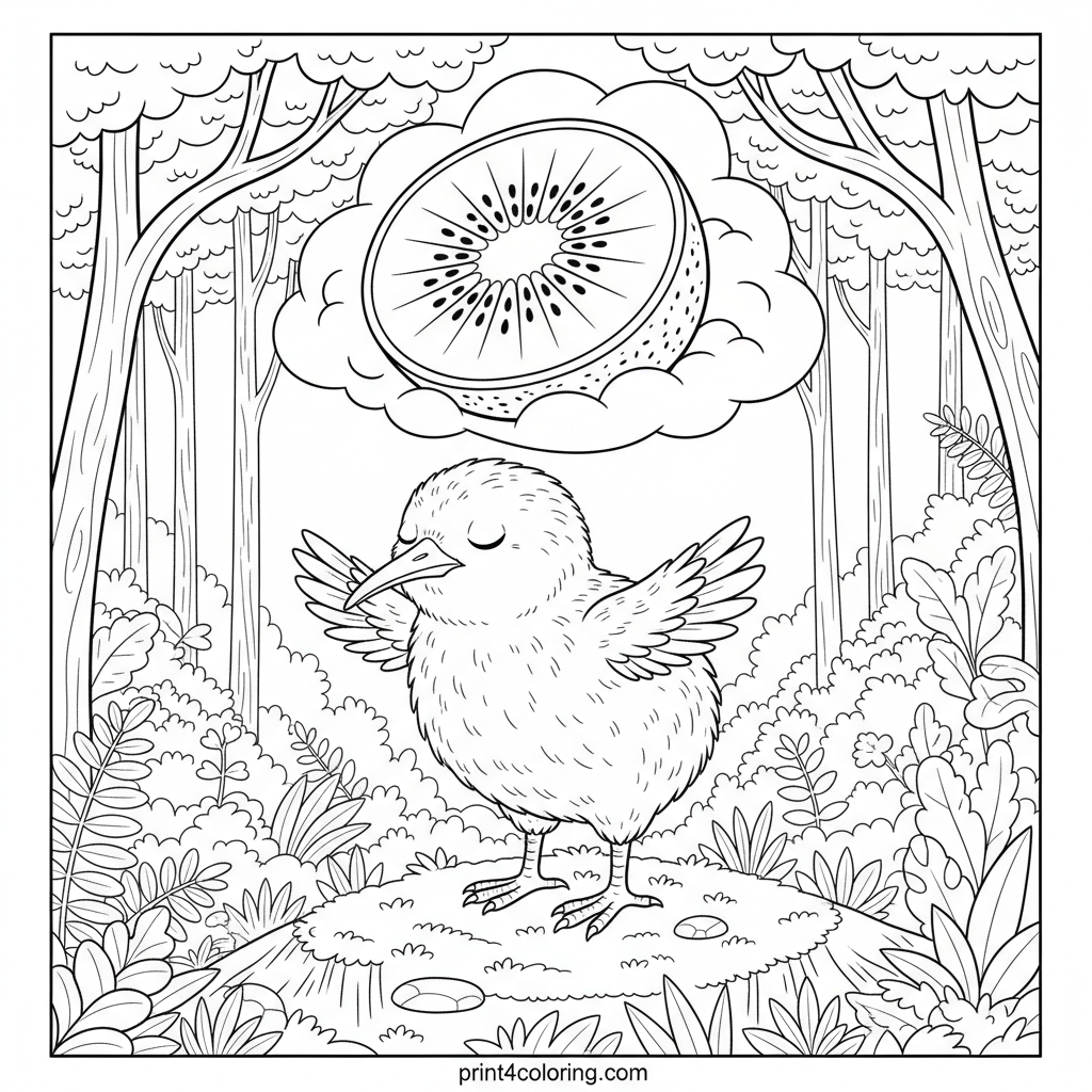 Imagine a sweet kiwi bird, deep in a detailed woodland clearing, dreaming of soaring! With eyes closed and tiny wings outstretched, it envisions flight. Above, a giant, fluffy kiwi fruit cloud drifts gently, adding a touch of magic to its hopeful dream. A realistic forest scene awaits your expert colors.