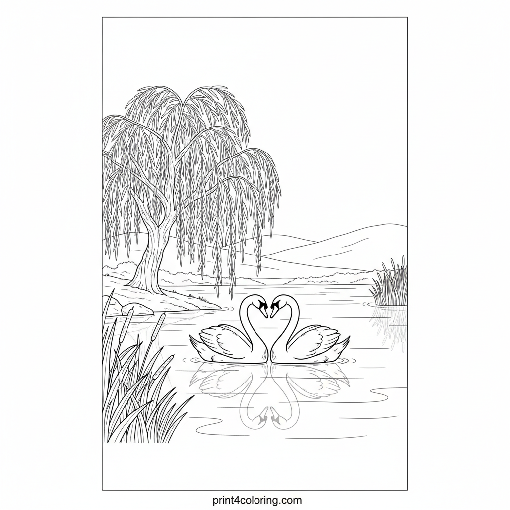 Discover a serene lakeside moment where two elegant swans form a beautiful heart with their graceful necks. They float calmly near a majestic weeping willow, its branches softly touching the water's edge. Notice the delicate reeds along the bank in this peaceful nature scene, perfect for detailed coloring.
