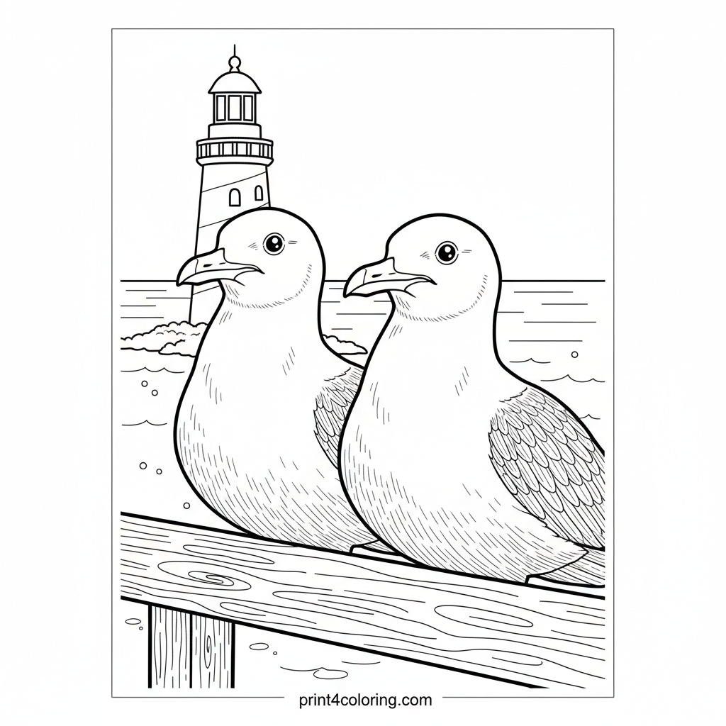 Lighthouse Guardians: Detailed Seagulls Coloring Page