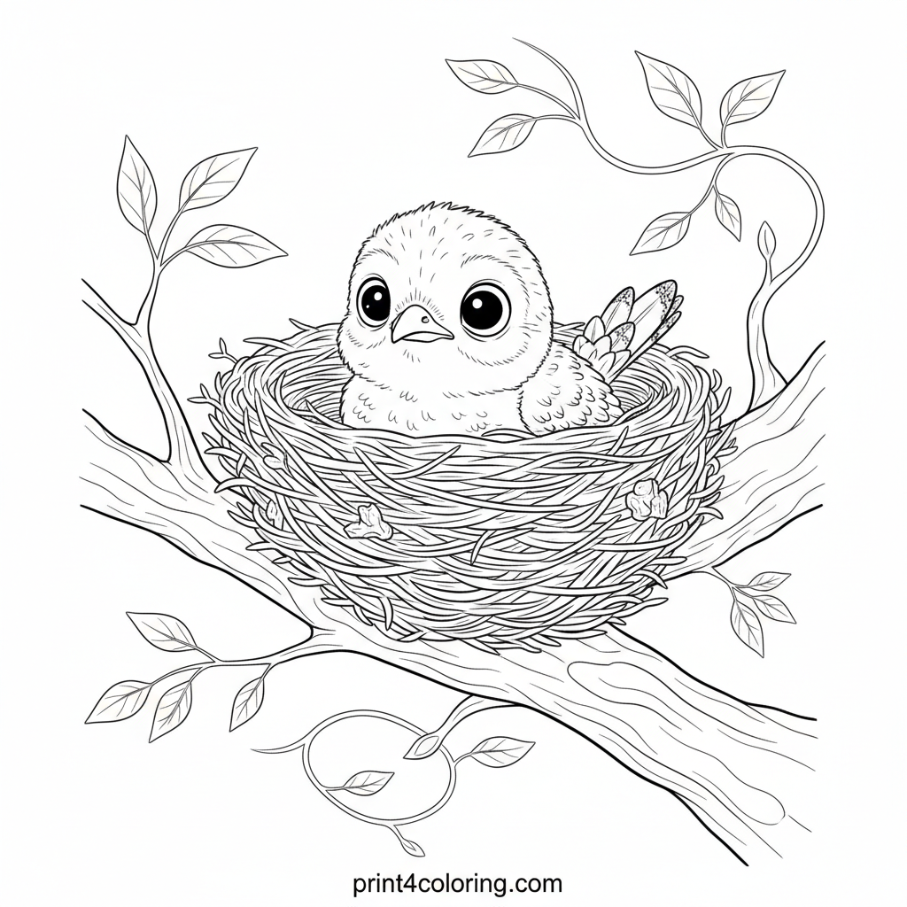 Witness a tender moment as a tiny, fluffy cuckoo chick, with large, innocent eyes, peeks curiously over the edge of its intricately woven nest. Delicate leaves and twigs frame this special scene, inviting you to bring its vibrant world to life with your colors. A truly heartwarming nature adventure awaits!