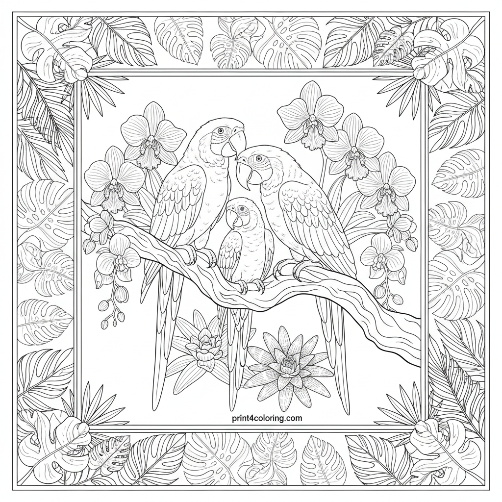 Immerse yourself in a vibrant tropical scene! This intricate coloring page features a loving macaw family – two adults and a juvenile – gently preening on a gnarled branch. Discover the beauty of exotic orchids and bromeliads detailed around them, creating a lush, patterned paradise. A perfect challenge for expert colorists!