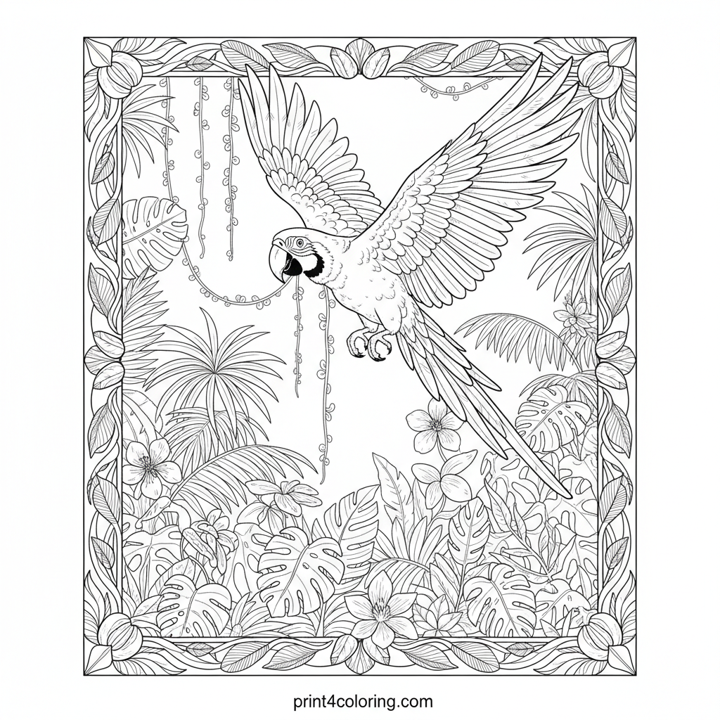 Embark on an expert coloring adventure with a magnificent macaw! This detailed scene captures the vibrant bird in full flight, wings spread wide, gliding just above a lush tropical rainforest canopy. Discover intricate leaf patterns and hanging vines, ready for your most brilliant colors.