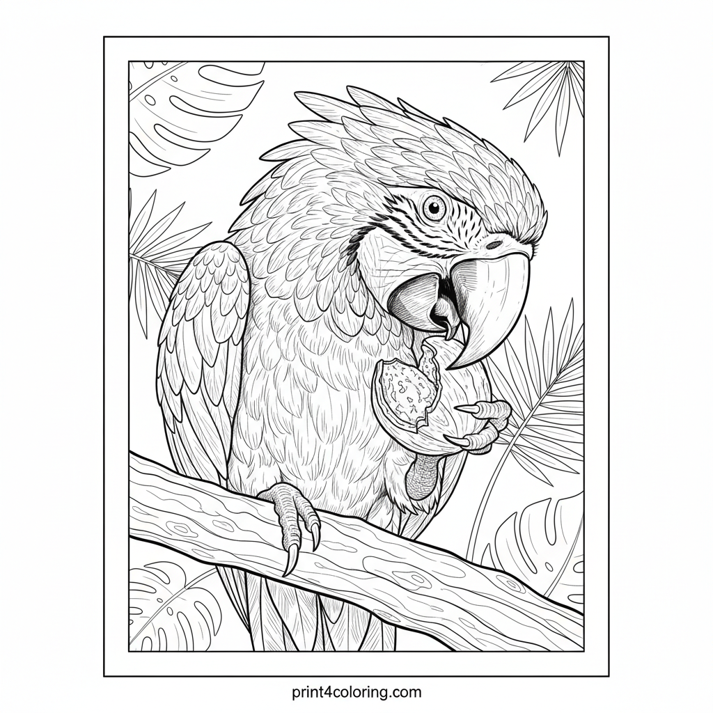 Witness a vibrant macaw's snack time in the rainforest! This expert coloring page showcases a magnificent macaw in exquisite detail, cracking a tough nut with its powerful beak. Focus on its intricate, colorful feathers, the nut's texture, and the lush tropical leaves for a stunning, detailed scene.