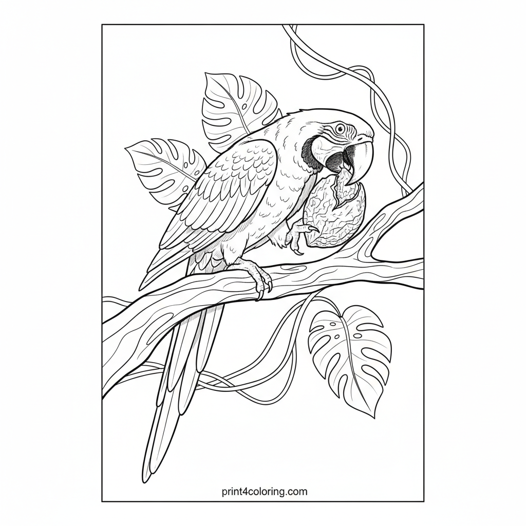 Enter the lush rainforest with this expert coloring page featuring a magnificent macaw! Watch as it skillfully cracks open a tough nut with its powerful beak, surrounded by intricate tropical leaves. Capture the macaw's vibrant feathers and the rich textures of its jungle home in this detailed scene.