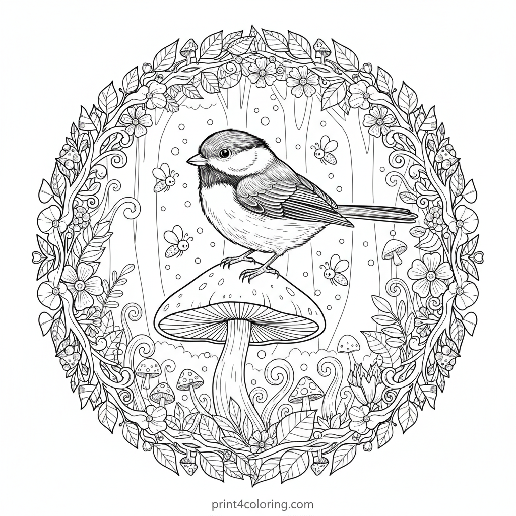 Magical Mushroom Chickadee in the Enchanted Forest Coloring Page