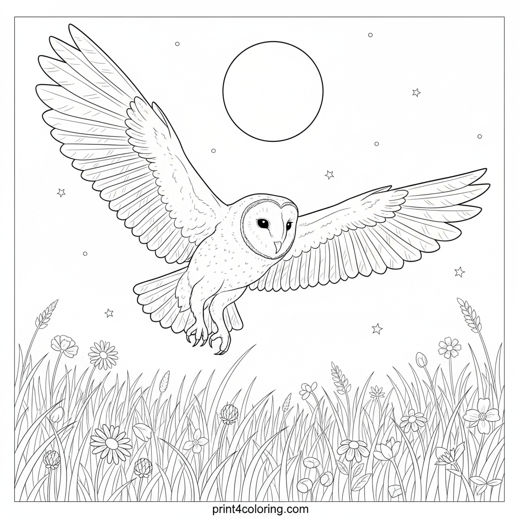 Majestic Barn Owl's Moonlit Flight Coloring Page